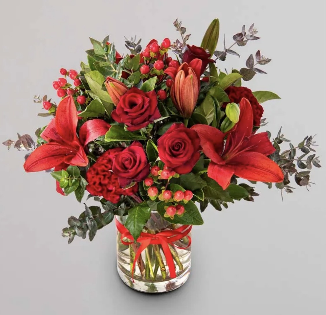 A magnificent large vase arrangement of red and green flowers and foliage. This is impressive.