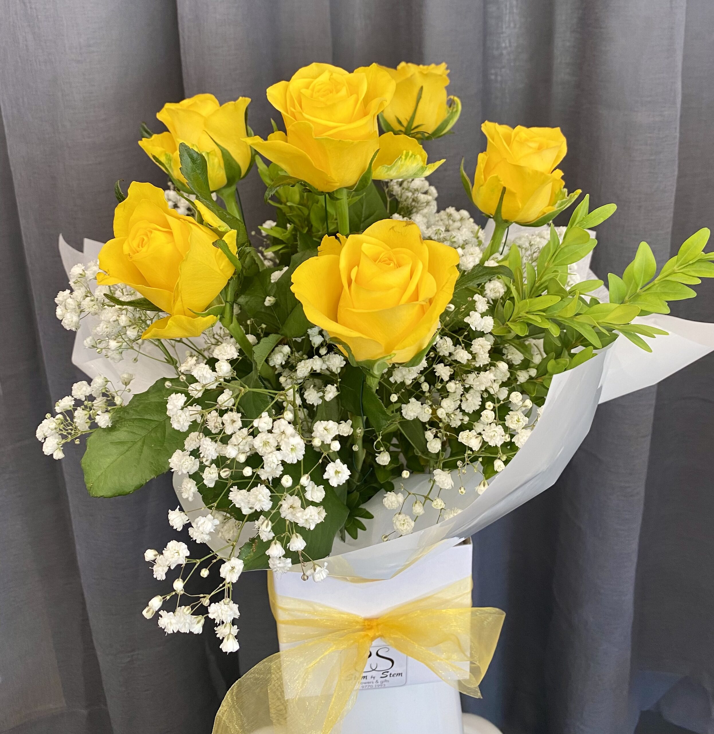 Yellow roses box foliage and gyp adorn this beautiful arrangement.