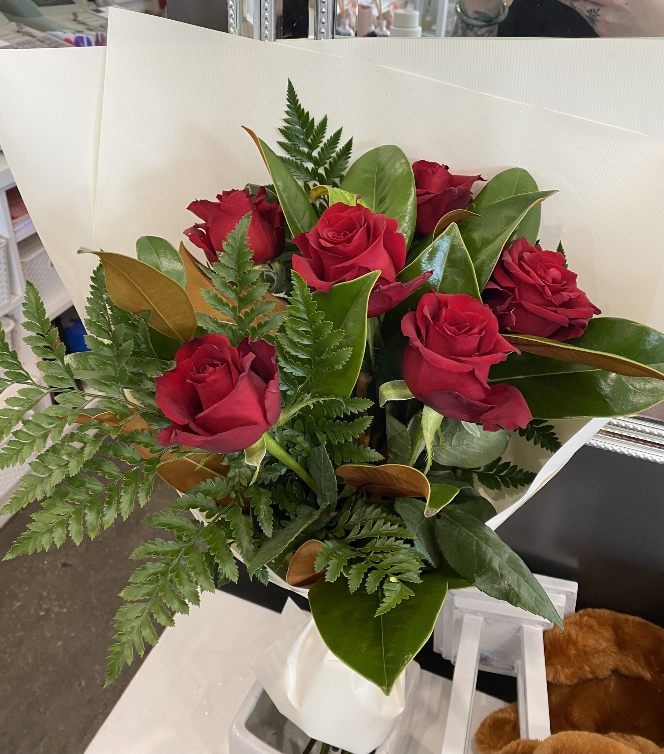Sometimes less is more, 6 red roses of premium quality grown here on the peninsula complimented with lush greenery, to make the roses the hero.