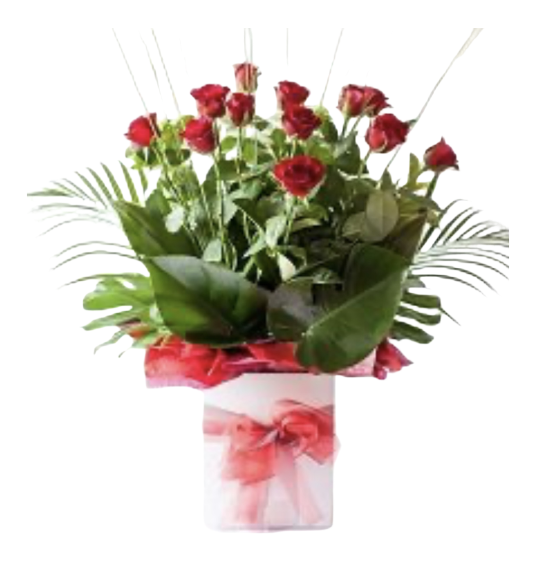 12 long stemmed red roses beautifully presented in a large white box. Elegant and desirable.